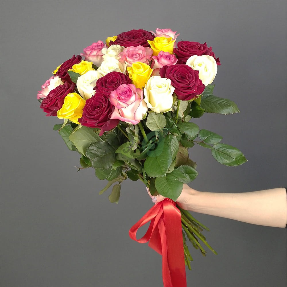 Букет 25 разноцветных роз будет к месту на любом праздник. Двадцать пять роз – это символ достатка. Даже в самом изысканном обществе такой букет будет принят с благосклонностью и с удовольствием, да и запомниться надолго.
